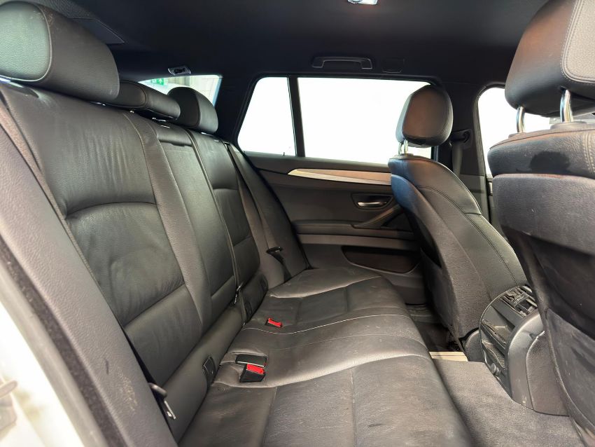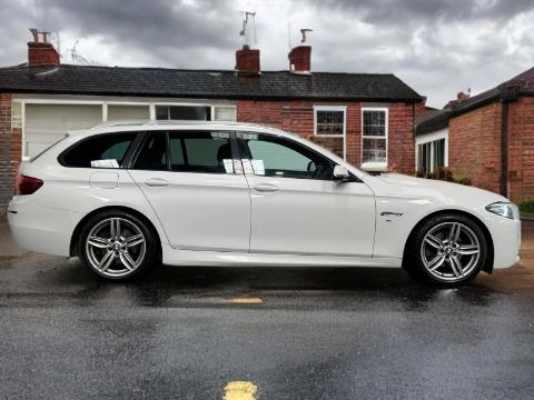 This 2014 BMW 5 Series 2.0 520d M Sport Touring Auto, finished in White, represents a premium offering within the executive estate segment. The vehicle is powered by a 1995cc diesel engine, paired with an automatic transmission, delivering power to the rear wheels. The BMW 5 Series is positioned as a luxury executive car, with the Touring (estate) body style offering enhanced practicality and cargo capacity. The M Sport trim level denotes a sport-oriented specification, typically including specific exterior styling elements, interior enhancements, and a sport suspension setup. Key specifications include a Harmon Kardon sound system, providing a high-fidelity audio experience, integrated navigation for route guidance, and Bluetooth connectivity for hands-free communication and media streaming. The interior features full leather upholstery, contributing to the premium feel and comfort. Parking sensors are included to assist with maneuvering, and privacy glass is fitted for increased occupant comfort and security. The vehicle is supplied with two keys. There are 14 MOT tests on record for this vehicle. Dimensions: 4,907mm long × 1,488mm high. This vehicle has had a single owner from new. **DISCLOSURES:**