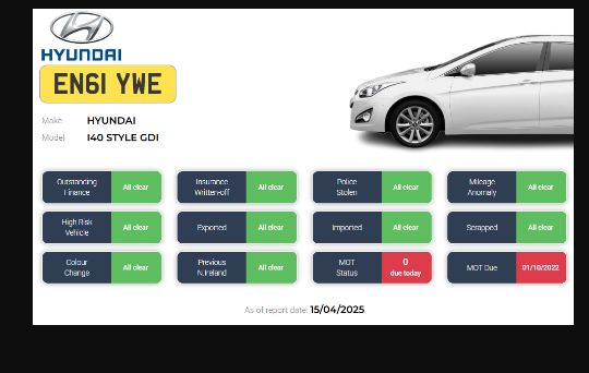 As of report date {15/04/2025} HPI report is all clear - See image!