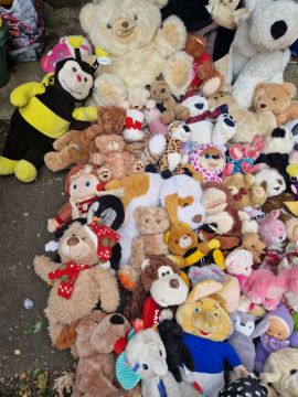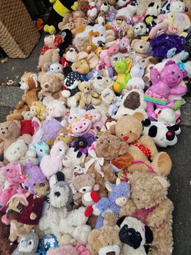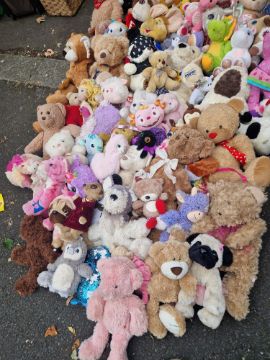 Selection of plush toys teddies all different sizes bears dogs zoo animals comes the big fairground teddies big husky and collie plus over 50 others see other items can pallet multi buys ideal for fairs hampers or tombolas