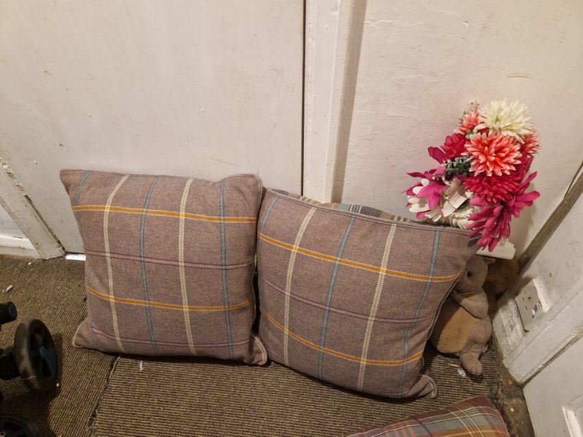 Quantity of cushions good quality feather filled tartan ones with matching throughs over 30 cushions throughts over 40 lots of lighting wal lights and lamps great for hotel b and b pallet service only on this lot could also contain over room items kettles phones ect