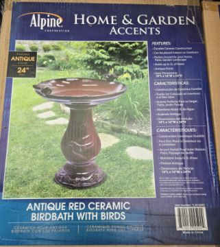 Red Ceramic Birdbath with Birds