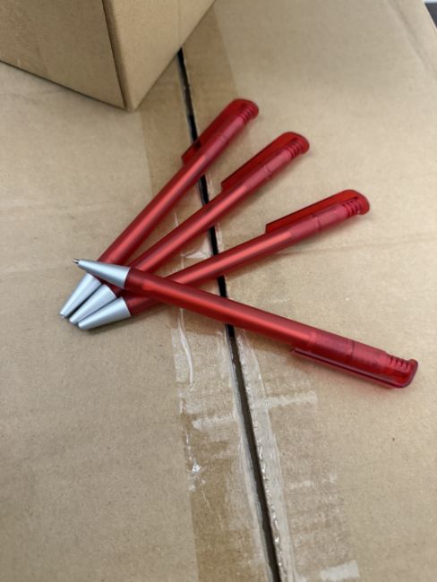BOX OF 1,000 BLACK INK PENS WITH RED FROSTED BODY.