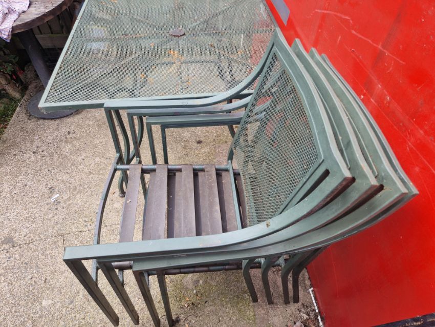 Garden table and 4 chairs leather strap seats metal frame 4ft square metal table comes with stone umbrella stand