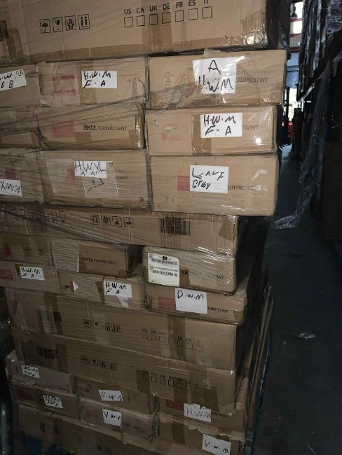 Full pallet of radiator covers – over 40 units in total. All items are new and unused. The boxes were opened only to inspect the condition of the products and then resealed. The pallet includes a mix of various sizes, styles, and colours.