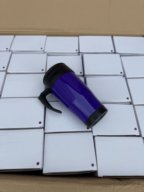 BOX OF 50 PURPLE THERMAL TRAVEL MUGS WITH HANDLES . Collection or postage