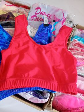 Lot 1 . 100 x Dance Designs. UK Manufacturer made with quality Heavy gauge materials. Crop tops mixed size style and colours approx rrp£1,200