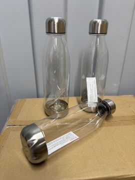 PALLET OF 600 CLEAR 700ML PLASTIC WATER BOTTLES WITH CHROME SCREW LIDS. 24 boxes of 25 .