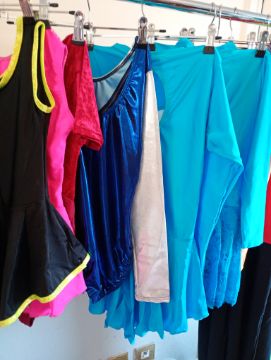Lot 1 . 100 x Dance Designs. UK Manufacturer made with quality Heavy gauge materials. mixed lot of remaining stock containing Tops Leotard Catsuits Hot pants Dress Skirts size style and colours approx RRP£1,200