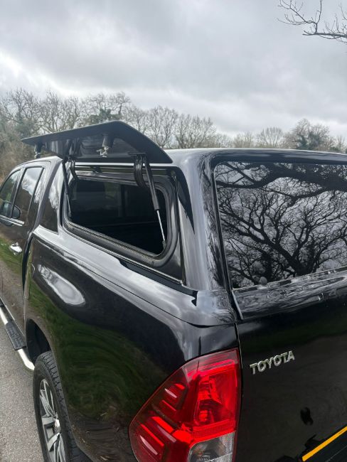 This 2019 Toyota Hilux Invincible X D-4D4WD DCB Automatic Pick Up in Black presents with 64,450 miles on record. It features a 2.4-litre Diesel engine, automatic transmission with hi/low 2WD/4WD functionality, and a single owner from new. The vehicle comes equipped with a rear Truckman canopy featuring side windows and is fitted with Bridgestone tyres. Inside, the specification includes heated black leather interior, DAB radio, Bluetooth connectivity, and a reversing camera. Additional features comprise heated screens, electric mirrors, cruise control, LED lights, and practical side steps. Remote locking is provided with two keys. The vehicle offers a substantial 3.5-ton towing capacity. Full Toyota service history is documented, and there are six MOT tests on record. The current MOT is valid, with the seller confirming the ability to provide a new 12-month MOT certificate for the next owner. Finance is clear, and no write-off history is recorded. This example offers a strong specification and clear historical records.
