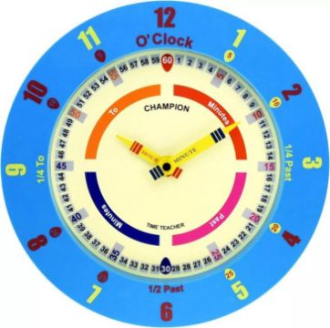 Add a touch of vintage charm to your child's room with this CHAMPION Since 1954 Teacher Learn to tell the Time Nursery Quartz Wall Clock. The round clock features an analogue display with a colourful dial that makes learning to tell time fun. The clock runs on battery power, making it easy to place it anywhere in the room. The frame is made of sturdy plastic, while the glass material adds to its durability. This wall clock also boasts a silent and non-ticking feature, making it ideal for a peaceful environment. Perfect for any room, this wall clock is a great addition to your child's room.