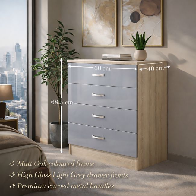 With its clean stylish design and rich high gloss finish, this Harmin 4 Drawer Chest will blend in seamlessly with any modern or traditional bedroom. The 4 Drawer Chest has been manufactured with the strength and sturdiness you look for in a chest, whilst the high gloss drawer front gives the piece that finesse that its been longing for.
