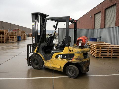 CAT LPG forklift with a 2.5-tonne lift capacity and high-reaching triplex mast, designed for demanding material handling operations.