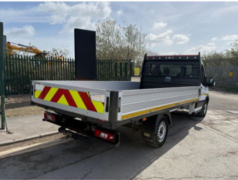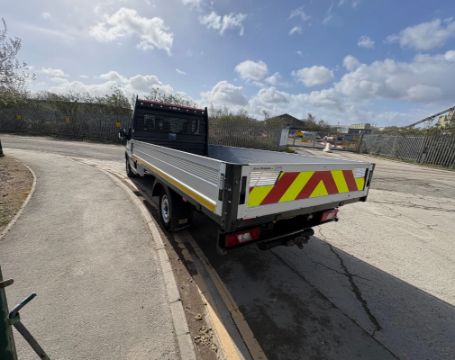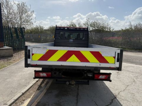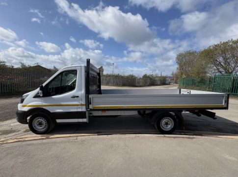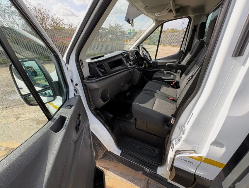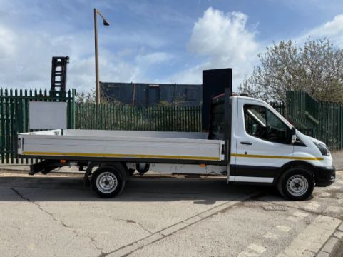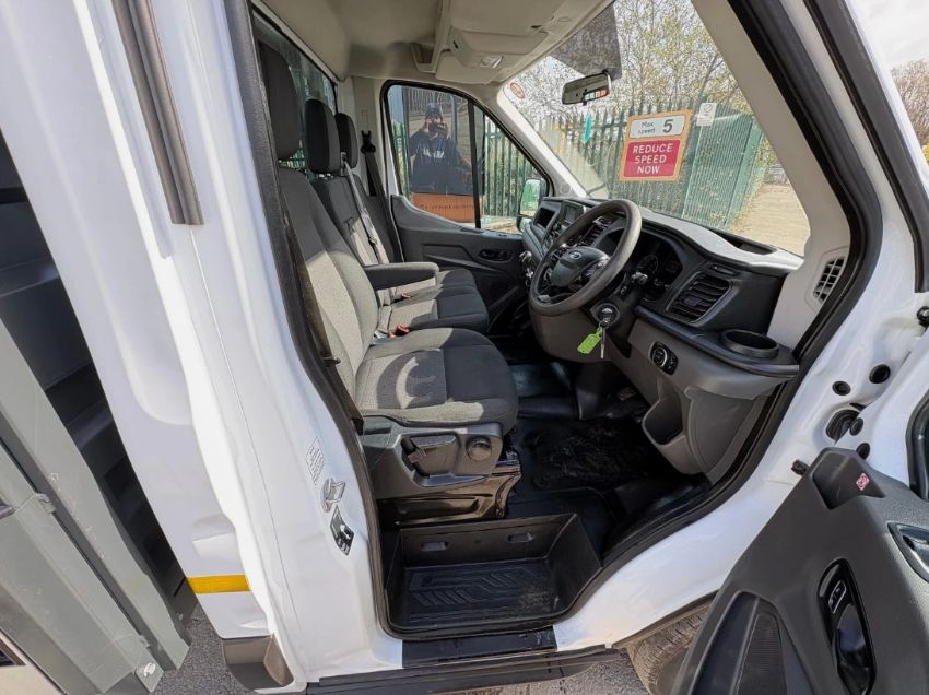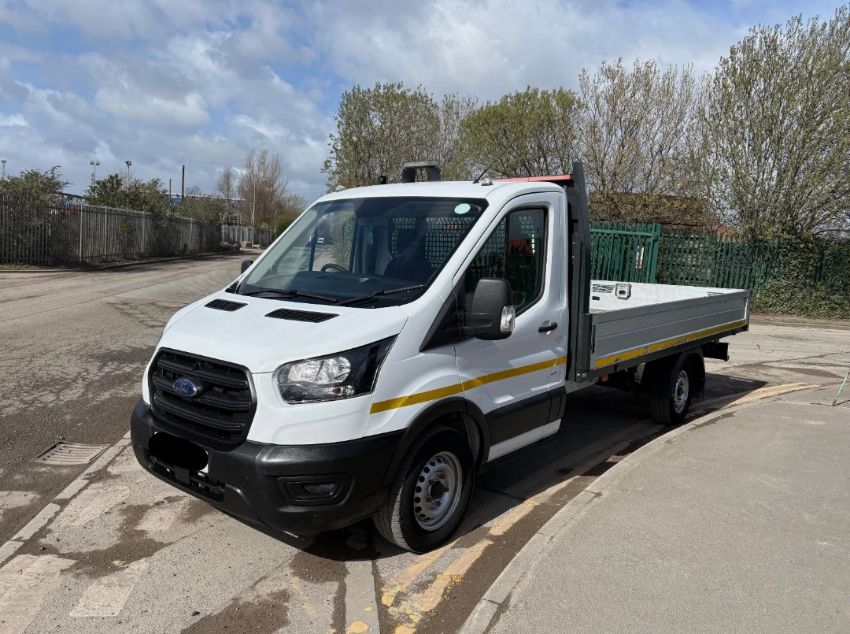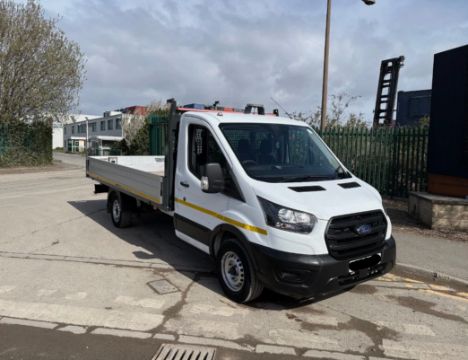 This 2022 Ford Transit 350 Leader EcoBlue 14ft dropside/flatbed pickup, finished in White, features a 2.0-litre Diesel engine paired with a manual transmission, showing 55,642 miles. The Ford Transit series is a well-established name in the light commercial vehicle segment, known for its utility and versatility. This particular model, the Transit 350, falls within the heavier-duty end of the Transit range, indicating a higher gross vehicle weight rating suitable for substantial loads. The "Leader" trim level represents a practical and functional specification within the Transit lineup. Its 1996cc EcoBlue engine is Euro 6 compliant, designed for efficiency and reduced emissions, and is coupled with a 6-speed gearbox. The vehicle comes equipped with DAB radio and hands-free connectivity for communication and entertainment. Practical features include a multifunction steering wheel, electric windows, a trip computer, and a factory-fitted towbar, enhancing its operational capabilities. Remote central locking is provided with two keys. This Chassis Cab model, ideal for various body conversions, has had two owners from new and has one MOT test on record, which it passed. The vehicle history check confirms no outstanding finance and no write-off history recorded. Dimensions: 6,022mm long × 2,176mm high. The drivetrain is front-wheel drive.
