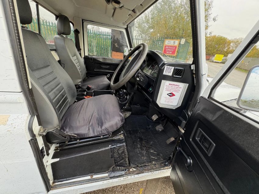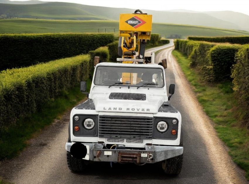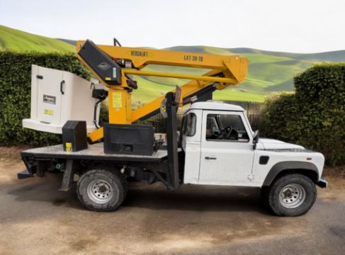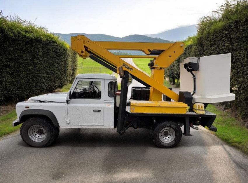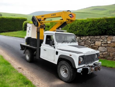 This 2011 (61 Reg) Land Rover Defender 130 TD Chassis Cab in white is equipped with a 2402cc diesel engine and manual transmission, displaying 118,694 miles. The vehicle is specifically fitted with a Versalift LAT-39-TB Cherry Picker / Access Platform, making it suitable for specialist applications. Its 4x4 drivetrain is configured for off-road and remote site access. The Defender maintains its renowned diesel engine and operates with a manual transmission. It features a rear access platform with controls, working lights, and stabiliser legs for operational functionality. The cab is presented as clean and tidy with cloth seats, and a tow bar is fitted, adding to its utility. With 17 MOT tests on record, the vehicle has a valid MOT. Mileage progression is consistent with approximately 9,130 miles per year since registration. Vehicle history checks confirm no outstanding finance, no write-off history, and no reports of theft. There have been no dangerous defects ever recorded against this chassis. This example has had four registered keepers. Finance is clear, and no write-off history is recorded.