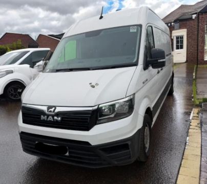This 2020 MAN TGE 3.140 L4H3 Panel Van, finished in White, features a 1968cc Diesel engine paired with a Manual transmission, displaying 183,000 miles. This Euro 6 compliant commercial vehicle comes with two keys and its V5 log book is present. The vehicle is offered for spares or repairs; the seller notes that it runs for loading purposes but is described as 'missy and smoky'. Vehicle history checks confirm no outstanding finance recorded and no write-off history. It has 4 MOT tests on record, with the latest test passed and valid until August 2026. The mileage progression across all MOT tests is consistent, reflecting typical usage for a long-wheelbase commercial vehicle. The MAN TGE is a light commercial vehicle, positioned within the large panel van segment, known for its robust build and versatility in various commercial applications. The 3.140 designation typically refers to a 3.5-tonne gross vehicle weight and a 140 PS (103 kW) engine output. This specific model, the L4H3, indicates a long wheelbase (L4) and a super high roof (H3) configuration, providing substantial cargo volume. The 1968cc Diesel engine is a common powerplant across the MAN TGE range, offering a balance of power and fuel efficiency for commercial operations. The manual transmission provides direct control over gear selection. The vehicle's dimensions are 6,836mm long × 2,590mm high. The drivetrain type is front-wheel drive.