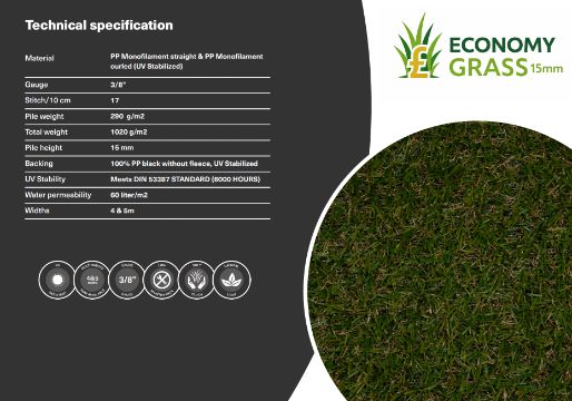 Economy Grass 15mm is a cost-effective artificial grass designed for domestic use, offering a neat, natural look with minimal maintenance. With a 15mm pile height, it provides a tidy, freshly cut lawn appearance—ideal for gardens, patios, and light-use outdoor spaces. Durable, easy to install, and pet-friendly, it’s a practical solution for achieving a clean green finish all year round.