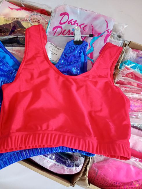 Lot 1 . 100 x Dance Designs. UK Manufacturer made with quality Heavy gauge materials. mixed lot of remaining stock containing Tops Leotard Catsuits Hot pants Dress Skirts size style and colours approx RRP£1,200