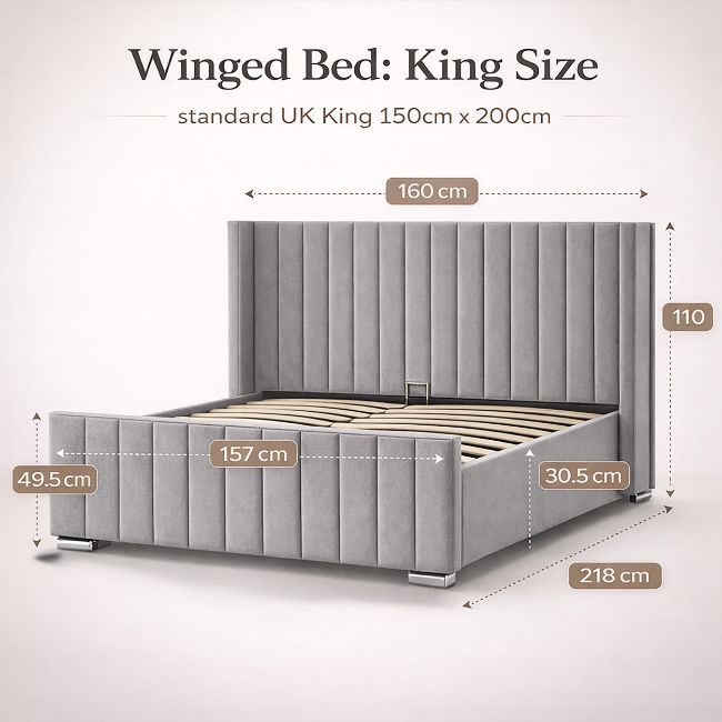 Transform your bedroom with this stylish winged King Sized ottoman bed, finished in a beautiful grey plush velvet fabric. Designed to bring together modern elegance and practical storage, this bed is the perfect statement piece for any contemporary home.