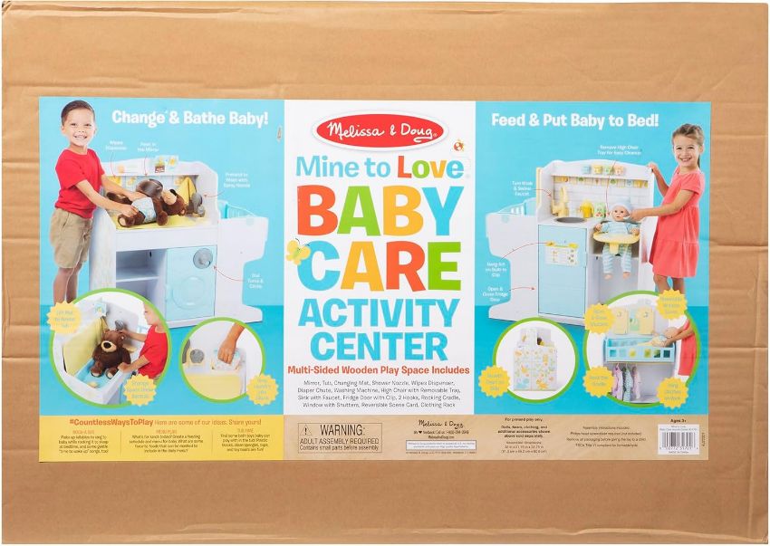 Melissa & Doug Mine to Love Baby Care Activity Centre, Wooden Multi-Functional Doll Playset with Kitchen, Nursery & Bathing Area, Pretend Play Toy for Kids Age 3