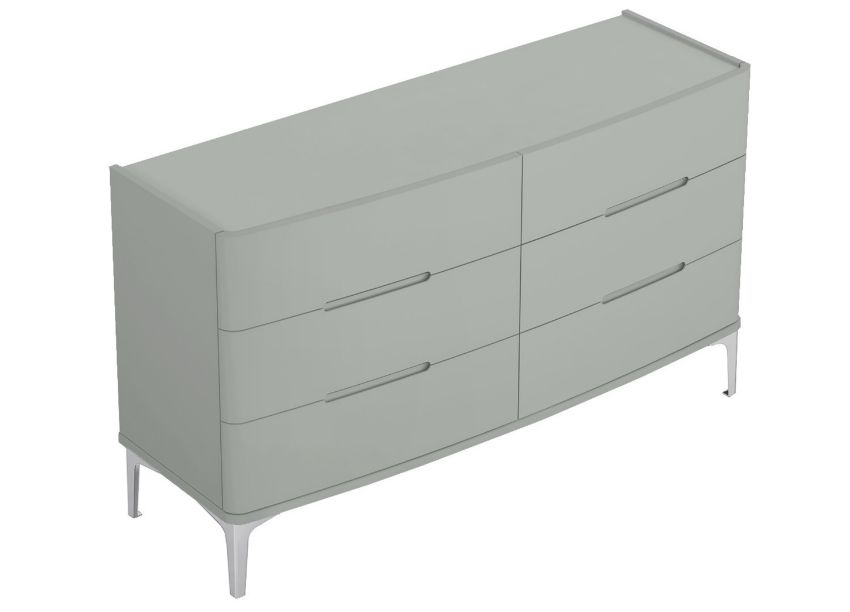 Arya deluxe 6 drawer dresser in cool grey high gloss finish, soft close runners fitted and sitting on solid metal feet, fully assembled.