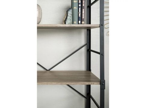 Looking for a shelf that delivers on function and style? Well, this mixed-material bookcase has got you covered. Lateral metal bars, angled brackets at the top, and a thin metal X detail on the back imbue an industrial element that will elevate the sense of character in any room. This 64-inch tall storage unit can be used as a bookshelf, media tower, or display shelf. It includes wall fastening hardware for extra stability.