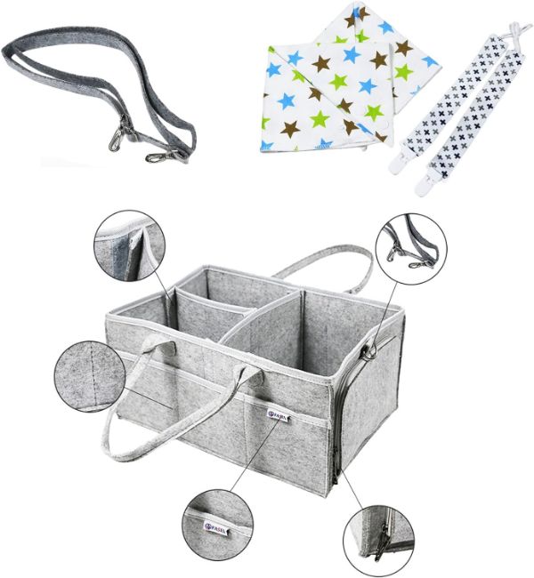- Multi-Purpose: Fasin nappy caddy organiser is collapsible and portable enough to be carried anywhere as a travel caddy. It comes with 2 Baby Bibs, Pacifier clips and Long Shoulder Strap for Easy Carry. Our multi-purpose caddy features two large compartments and one smaller compartment, you can use this diaper organiser to store baby toys, books or use it as a nursing station or even for cosmetics.