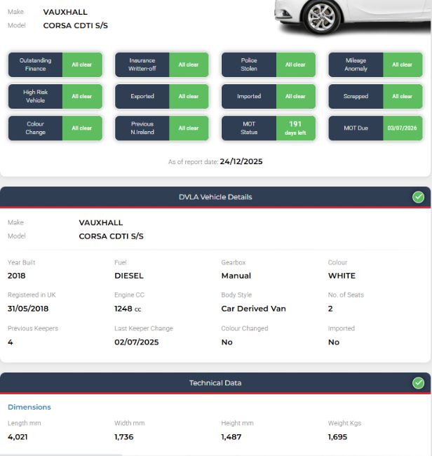 This 2018 VAUXHALL CORSA CDTI S/S L1H1 (4,021mm long × 1,487mm high) Car Derived Van, finished in White, features a 1248cc engine paired with a manual transmission, showing 85,570 miles. It is Euro 6 compliant and ULEZ free until July 2026. The vehicle was registered on 31/05/2018 and has four keepers on record, with the last keeper change noted on 02/07/2025. It is supplied with two seats and is not an import, nor has its colour been changed. Features include cloth trim, electric windows, Bluetooth connectivity, CD player, multi-function steering wheel, and central locking. The seller highlights its very economical nature and confirms it is a company direct vehicle, a Diesel EcoFlex model. Seven MOT tests are on record, all showing a logical mileage progression with no discrepancies. The vehicle has a valid MOT. Finance is clear and no write-off history is recorded.