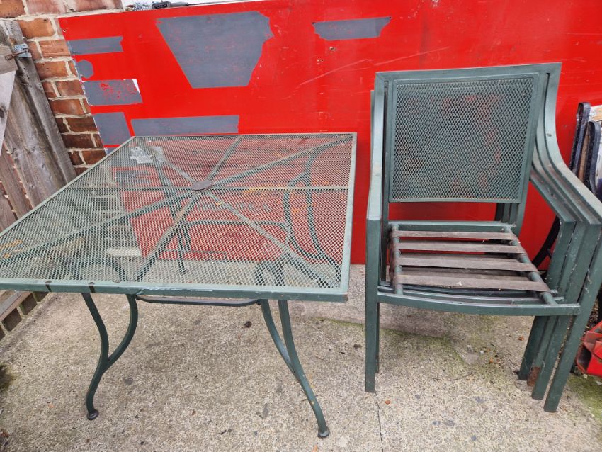 Garden table and 4 chairs leather strap seats metal frame 4ft square metal table comes with stone umbrella stand