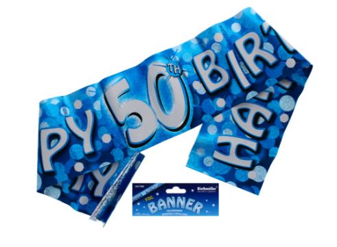 144 x 50th B-DAY HOLOGRAPHIC BANNER BLUE (12/288)