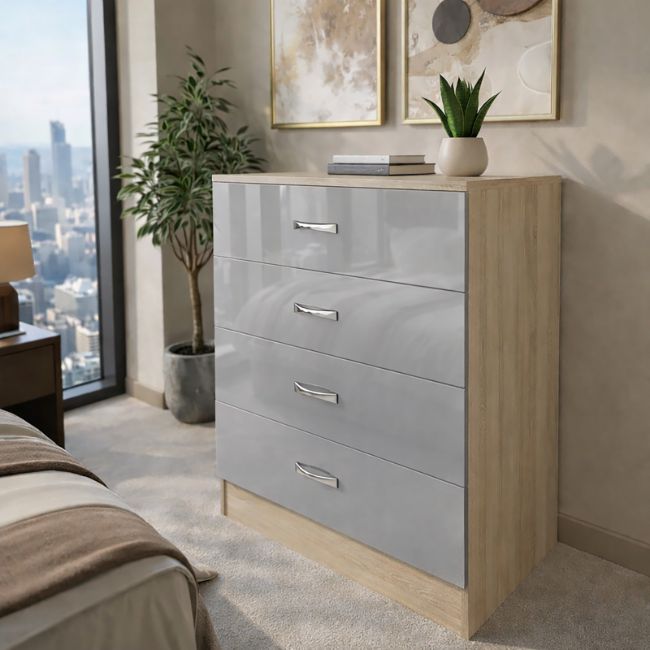 Chest of 4 drawers - The 4 drawer chest is an excellent addition to our high gloss bedroom furniture range of stylish yet affordable furniture. The 4 drawer chest provides you with the storage space that a wardrobe cannot. The sturdy individual drawers are in one column of 4. They can take a remarkable amount of weight due to the high strength manufactured wood veneer frame. The drawers fit flush and are manufactured to strict conditions which mean they are stable and firm.