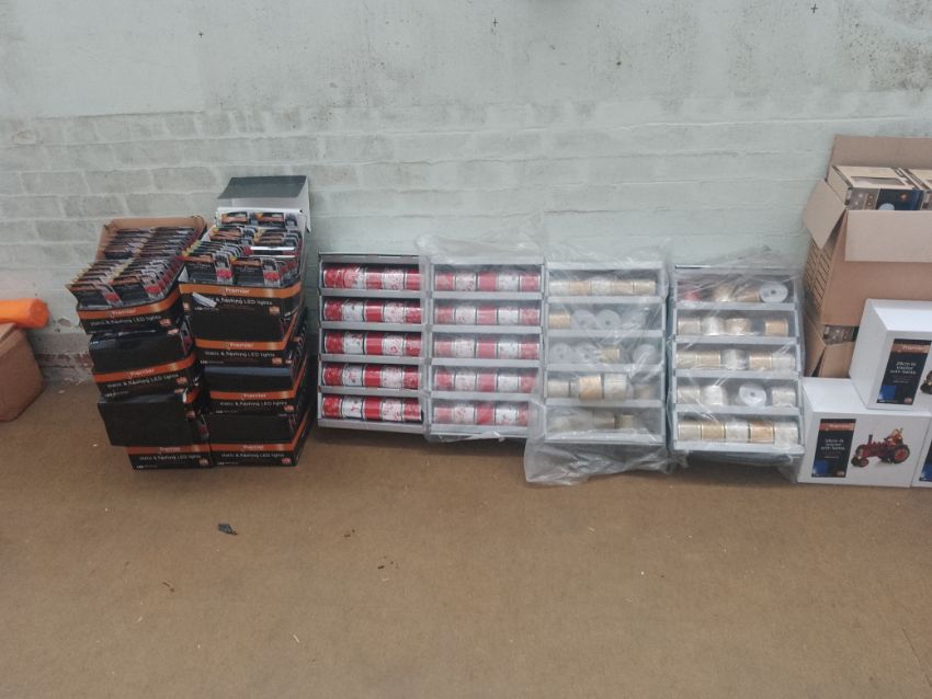 > Mixed Christmas products approx 450 led Christmas lights, approx 40 red ribbons, Christmas baubles, different styles of ribbons and a mixture of Halloween products mixed in