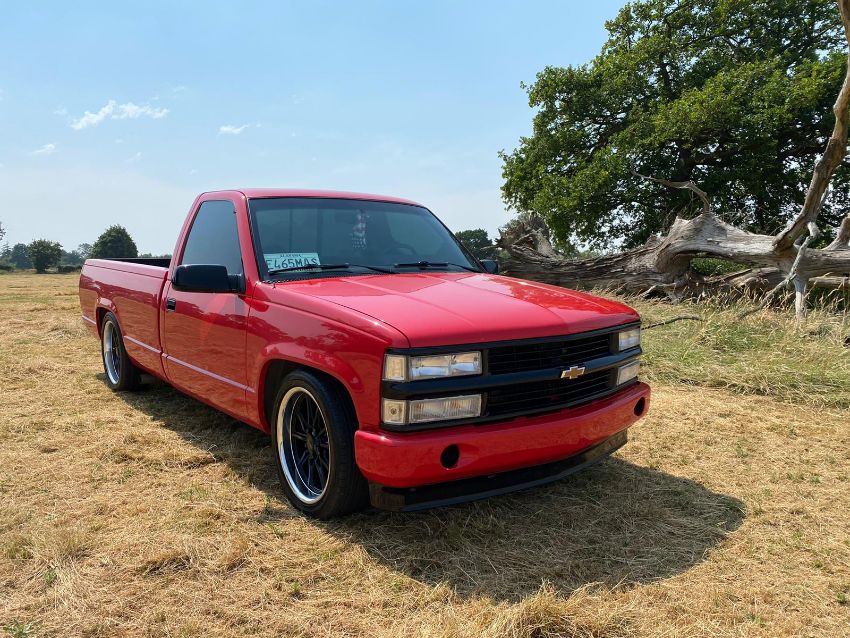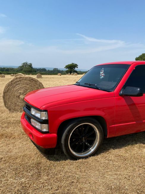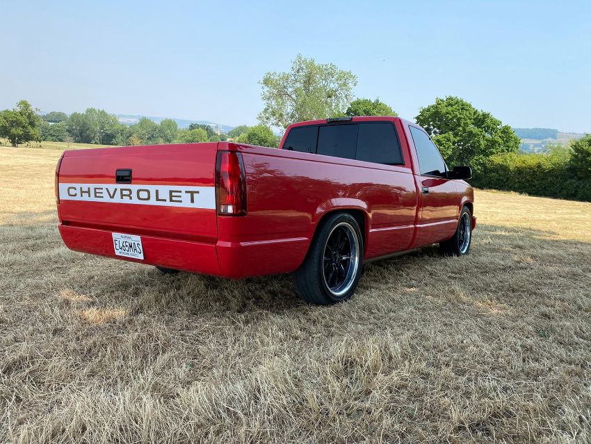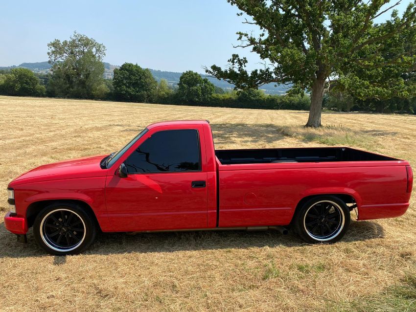 Full Respray in Chevrolet Super Red, 99% new electrical components, New American Racing wheels and tyres, full mechanical overhaul, Custom made African Buffalo leather bench seat including trimmed door cards, Retrimmed Headliner and sun visors in Maserati Grey fabric, lowered suspension with all new brake pipes and all new steering components, New full stainless custom made exhaust system, Rear pick up bed treated and painted in thick hard wearing bed spray ( raptor paint ), Rebuilt Steering Box, Custom made rear steel rolled bumper All earths have been re-wired and located in optimal locations, majority of the whole vehicle has received a full rewire mainly wiring loom for lights all in the correct wiring colours and location but with higher quality loom.Runs and drives excellently, has had the following replaced with high quality parts sourced from a very reputable UK based US parts company. New distributer (including all hardware), new Ignition control module, new HT leads, new spark plugs, new, coil pack, new idle control valve, new MAP sensor, new temp sensor, new O2 sensor, new fuel pump, new ignition relay, new brake fluid reservoir with new seals, tappets have been checked and adjusted accordingly, timing has also been checked and confirmed correct Full custom buffalo leather bench seat with custom quilted stitch, original door cards have been recovered in areas with the same African buffalo leather with original colouring still on show with age related wear and weathering but including new switches and weather strips, dashboard has custom made leather dash cover in the same African buffalo leather, glove box lid / door is also covered in the same leather. Headliner is freshly covered including the sun visors with Maserati grey fabric, carpets throughout the vehicle are original and in very good condition but with ever slight minor age related wear in small areas of the drivers footwell Excellent exterior condition, freshly fully painted in Chevrolet Super Red, new American racing wheels with brand new tyres, new lights and lenses all round, new LED load bed light, custom printed “Chevrolet” decal across the tailgate backed in white with black lettering, custom made steel rear bumper, new light up Chevrolet badge fitted to the freshly painted grill. Ready to jump in and go ! Perfect for shows, fits most motorbikes in the back to use as a toy hauler, absolute show stopper ! Gets so many looks and thumbs up !