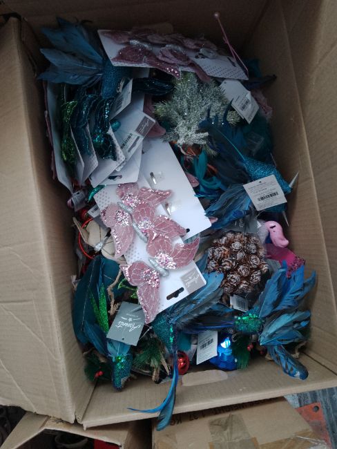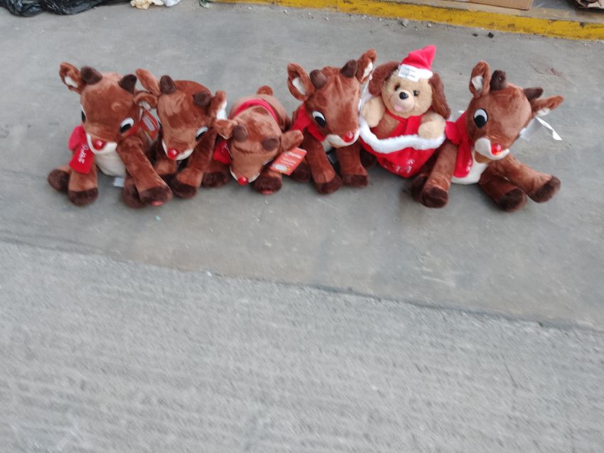 > Christmas pallets with a mixture of different things including stuffed animals, lanterns and approx 10 canvases