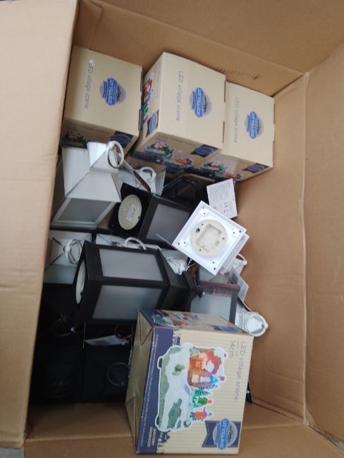 > Mixture of faulty and good items - approx 4 box of water spinners, candle bridges, train snow globes, electric candles and decorations