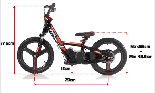 A super light electric-powered motor bike that has been specifically designed for kids, Weighing in at only 11kg's. The bike can be used as a conventional balance bike when learning to balance with its specially designed free wheel system. Then watch the rider improve and progress onto the slow speed setting (8mph) balancing on their own using the foot pegs. Perfecting their throttle control at the same time using the bikes twist throttle. Once they are confident using the slow speed setting they can then progress to the medium speed (10mph) and fast speed setting (12mph). Features hybrid rubber air filled tyres suitable for various ground types & a chain-driven motor that delivers reliable performance.  The 16" Plus features the following upgrades over the standard 16" model - Front suspension, Metal wheels, rear disc brake, handlebar pad, full grip throttle, 3 speed settings, anodized handlebar, anodized seat clamp and a brushless 250w motor.