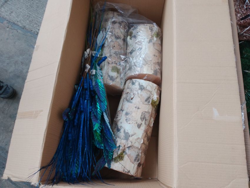 > New products, Christmas items a mixture including ribbons, toy train, indoor festive logs, toys, boxes of festive ribbons, a box of candles