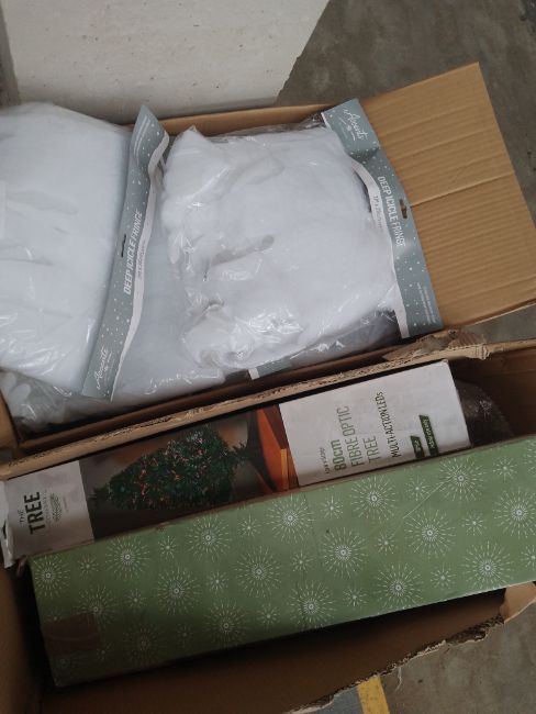 (P134) - 1 Return pallet of trees, fake snow, fibre optic trees, festive scenes and ornaments