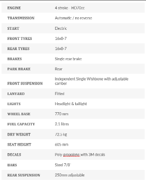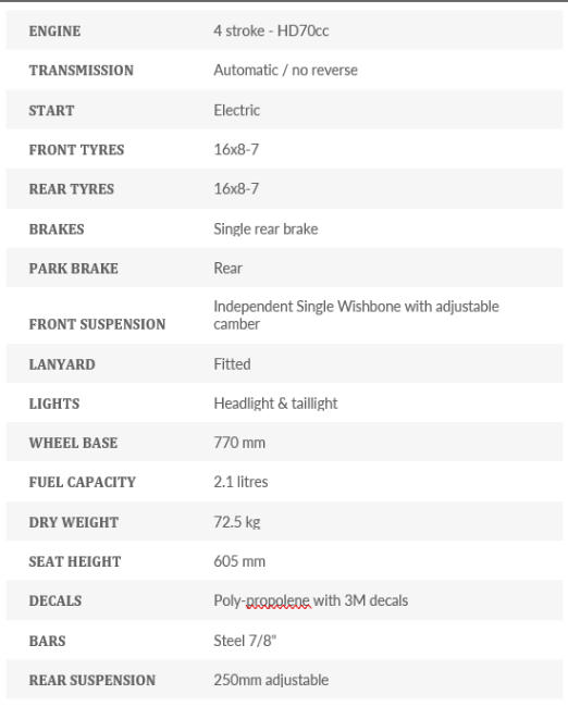 Kayo ATV’s are designed to be ridden regularly and are thus totally serviceable. The Fox70 maybe great value for money, but do not confuse it with generic Chinese rubbish you will find online from many other retailers, this is truly a serious quad bike. If you are looking for a quality, rugged and stable ATV designed to last many years with an unprecedented dealer network & spares back-up, The Fox70 is definitely for you