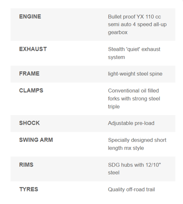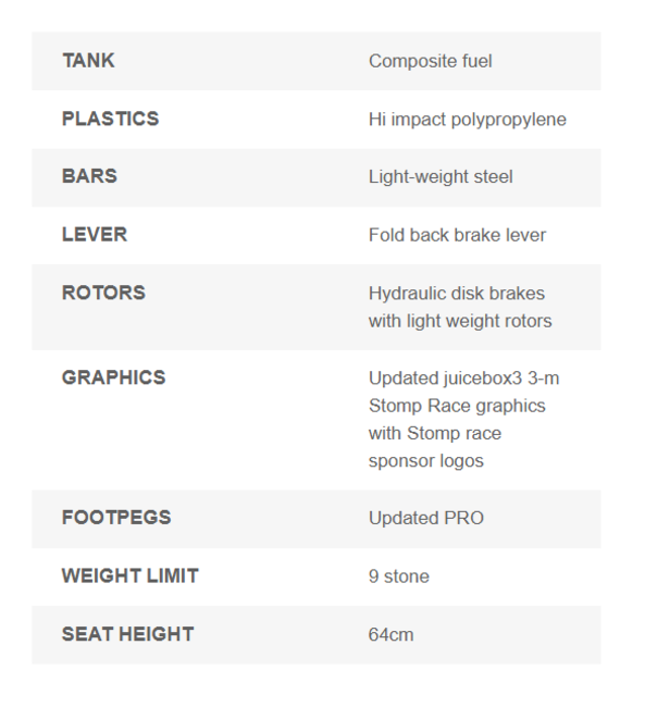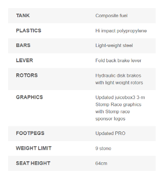Welcome to the Generation 3 juicebox, this time specifically designed with those who are vertically challenged in mind. We have done away with all the fancy stuff and decided to give you exactly what you've been asking for: a small pit bike suitable for small people at a reasonable price. Although small, the Juicebox3 is perfectly formed and incredibly tough and durable. Taking its geometry from the Honda CRF50, with low sculpted seat and 12/10 wheels, the JB3 sits at only 64 cm off the ground, perfect for any beginner or BIG KID alike (the JB3 will take a rider up to 9 stone). Updated with new Stomp Race graphics and new PRO footpegs.