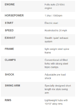 Due to popular demand, the Minipit is back. This time she’s smaller and more perfectly formed. Fitted with a fully auto 60cc engine. A high spec entry level bike which will hold her head up in any paddock.