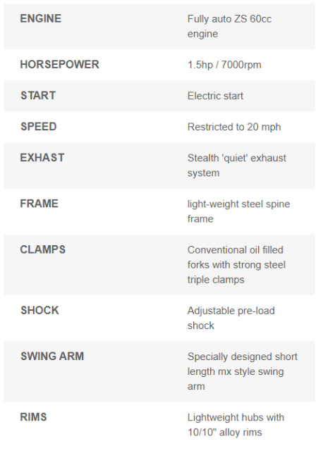 Good deliverable power aimed at the mini-racer. Packed with high spec parts and built to be light, this is the best little bike we have produced to date.