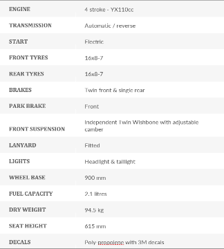 The Raging Bull 110 features electric start and is fully automatic with adjustable throttle restrictor & safety cut-out lanyard. The exhaust has been designed to be quiet & the electrics are of quality construction to cope with regular power washing. One key features not to be missed is the fully independent double wishbone front suspension making this ATV stand out as the top performer in its class. The handling and stability really are second to none.