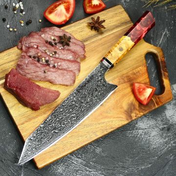5 x Damascus 8 inch steel knives with coloured red resin handle - with sheaths