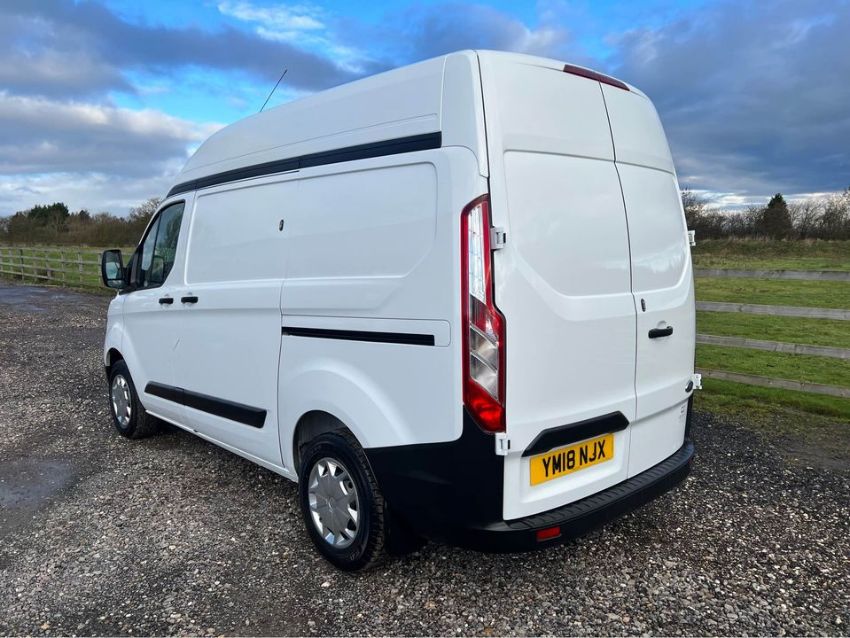 2018 18 reg facelift ford transit custom 2.0 Tdci swb 130 bhp high roof 300 L1 H2 fwd EURO 6 ulez van 6 speed manual in factory ford solid frozen white with unmarked 3 seat cloth trim. This van comes with electric tinted windows, ford sync Bluetooth, ford radio with aux/usb input, multi function steering wheel, remote central locking, side loading door, ply lined rear, removable racking, factory steel bulkhead factory wheel trims with recent tyres