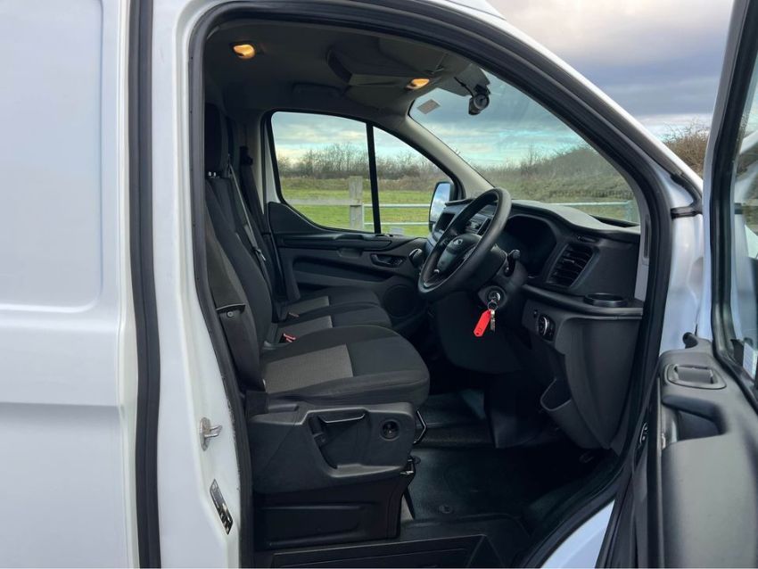 2018 18 reg facelift ford transit custom 2.0 Tdci swb 130 bhp high roof 300 L1 H2 fwd EURO 6 ulez van 6 speed manual in factory ford solid frozen white with unmarked 3 seat cloth trim. This van comes with electric tinted windows, ford sync Bluetooth, ford radio with aux/usb input, multi function steering wheel, remote central locking, side loading door, ply lined rear, removable racking, factory steel bulkhead factory wheel trims with recent tyres
