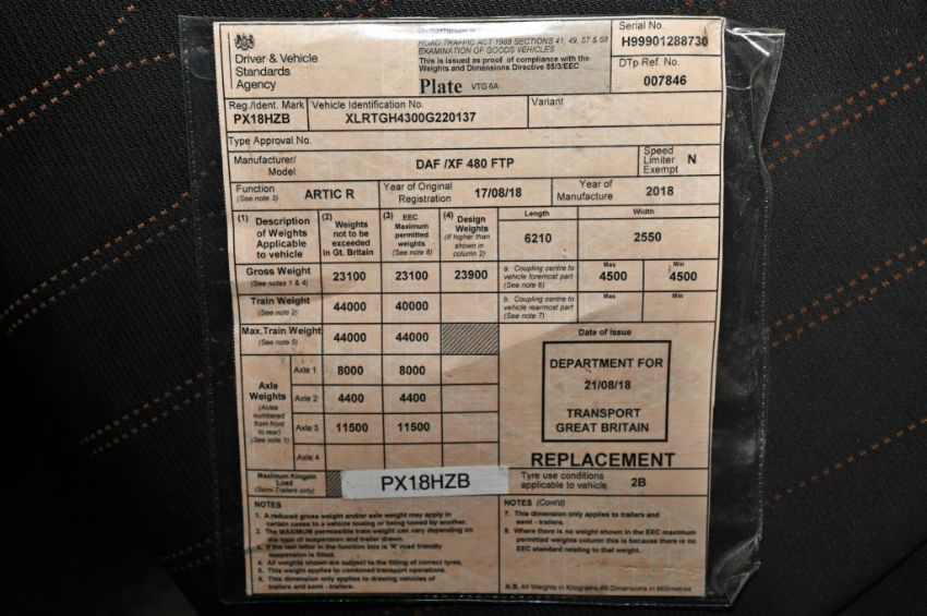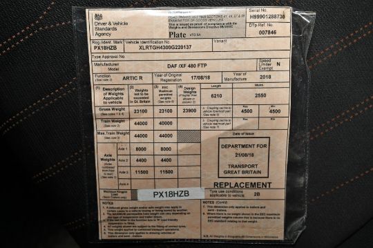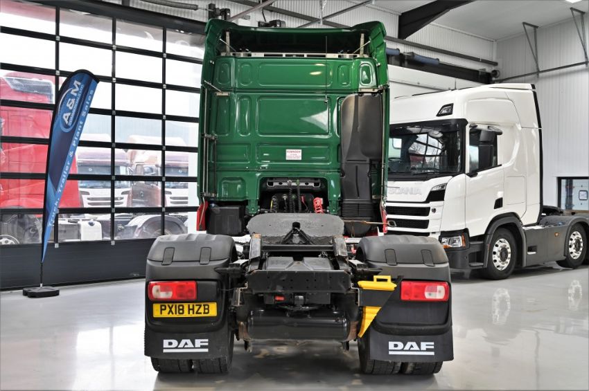 2018 (18) DAF XF480 Spacecab, Euro 6, 6x2 small wheel midlift, 3.8m wheelbase, Alcoa alloy wheels, automatic gearbox, engine brake, 510L fuel capacity, AdBlue tank behind the cab, fixed 5th wheel, rear mounted batteries, catwalks, visor, high sleeper cab, twin bunk, fridge, air con, Stereo/USB/AUX/Satnav, MOT July 2023, excellent condition.