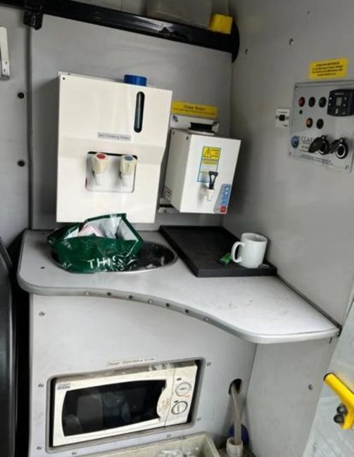 Internal lights, microwave, hot water, sink, 7 seats and table