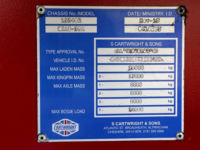 2015/2016 Cartwright 4556mm Curtainside Trailer, BPW tri-axle on aiairr suspension, drum brakes, rear barn doors, 2.87m loading height through the rear, XL rated curtains, raise lower valve, Jost legs, Trailer Info Module, MOT October 2023