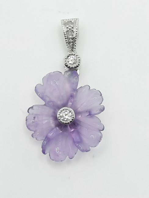 Elegant Amethyst and diamond flower necklace in 9ct White gold. The amethyst has been hand-carved into the shape of a flower with natural white diamond in the centre and suspended on a diamond bail.