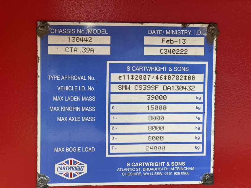 2013 Cartwright & SDC 4550mm Curtainside Trailer, BPW tri-axle on air suspension, drum brakes, 9ft 6inch side loading height, rear barn doors, 2.874m loading height through the rear doors, XL rated curtains, raise lower valve, Fontaine legs, Trailer Info Module, MOT April 2023